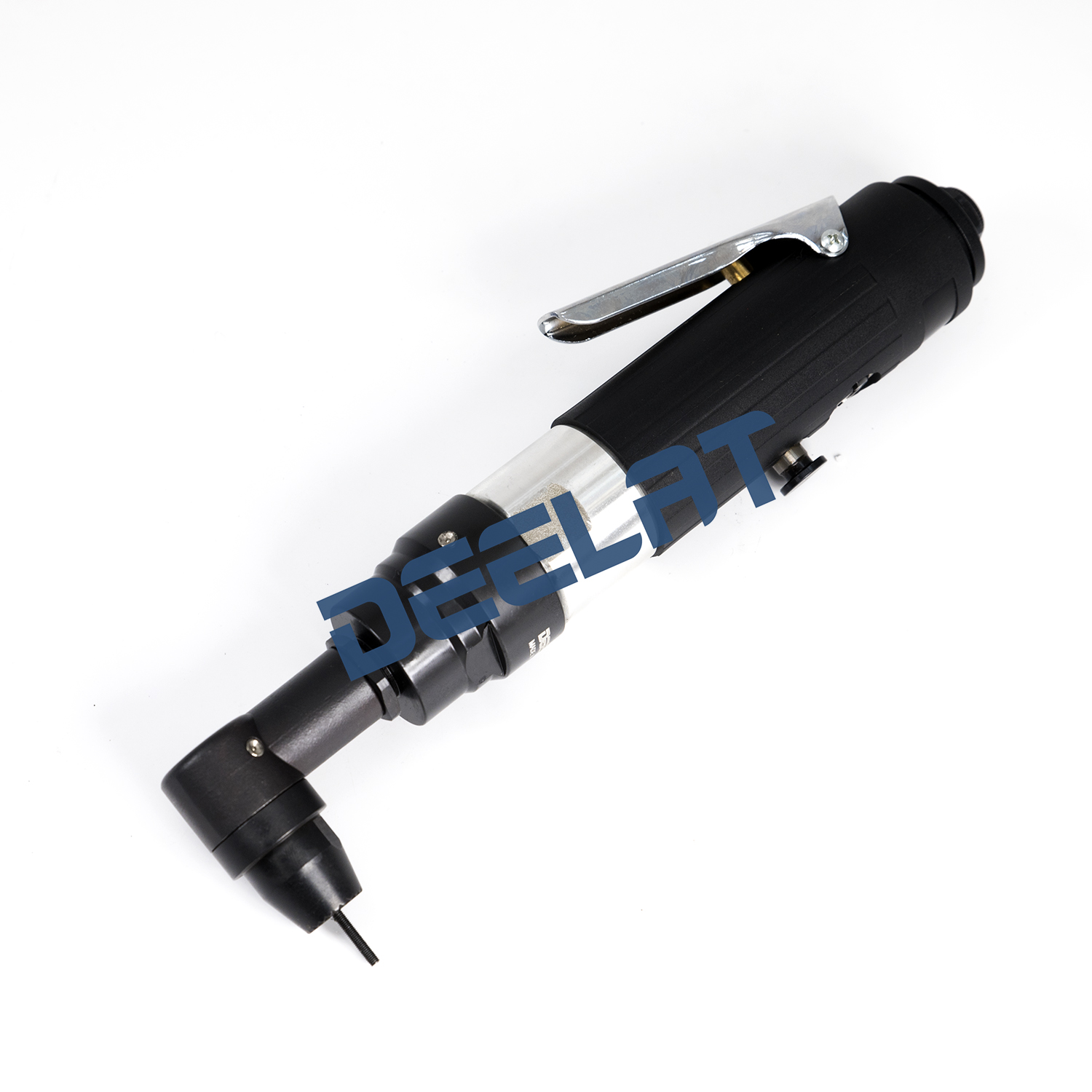 The rivet tool has a 5 millimeter nozzle size, a 90-degree-angle headpiece and a freeload speed of 1600 RPMs. The overall length of the tool is 270 mm, and it utilizes a rear air exhaust.