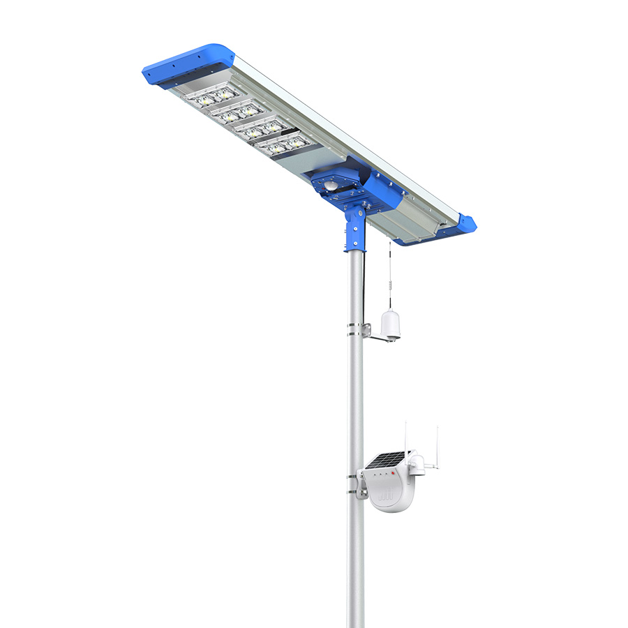 The solar street light is 8000 lumens and has dimensions of 163.7cm x 39.5cm x 36.4cm. The unit has aluminium alloy and tempered glass construction and integrated LEDs. It has a light radius of 675 square meters, a colour temperature of 4000 and a waterproof IP65 rating.